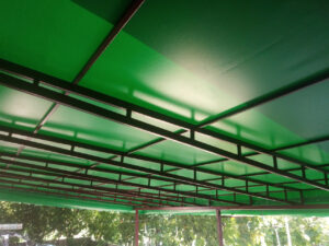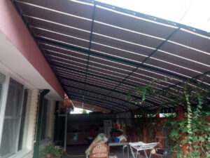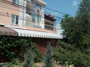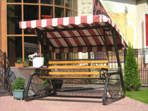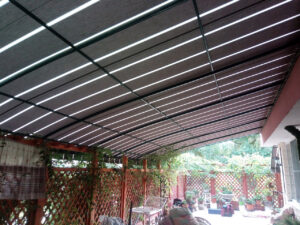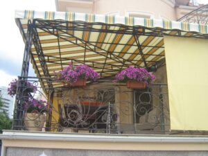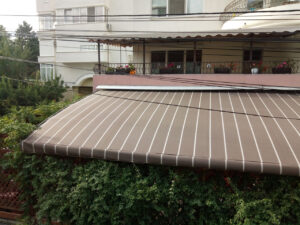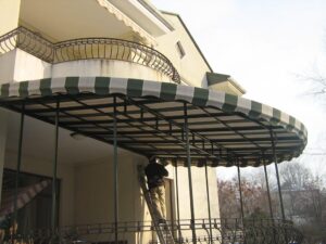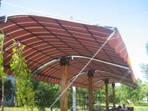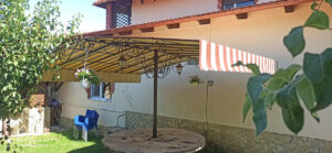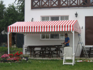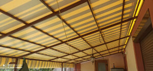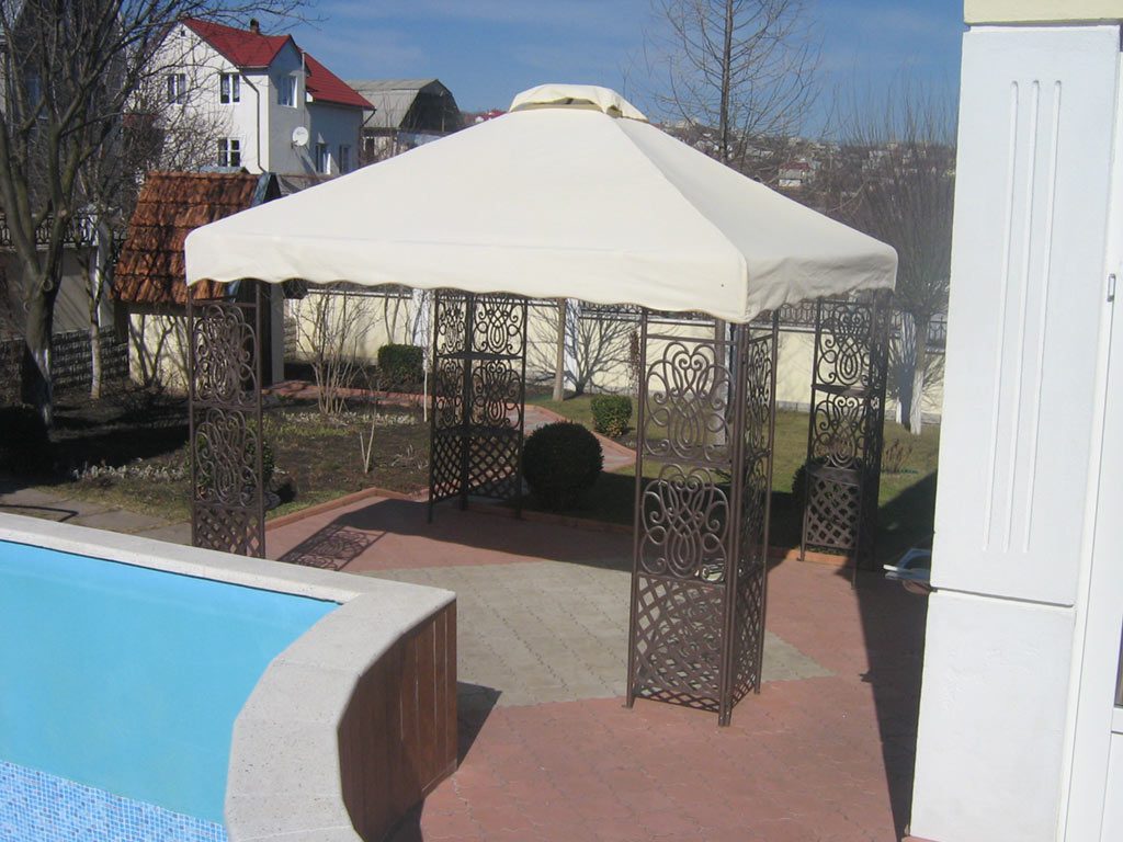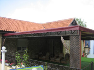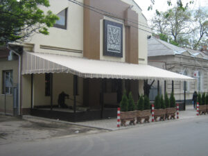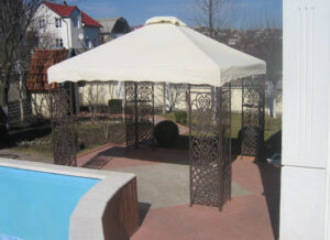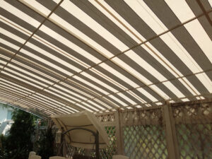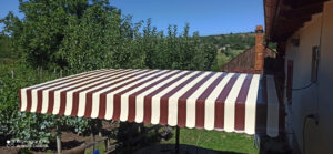 O combinație populară și foarte estetică: acoperiș din țesătură PVC, iar volanele perimetrale din pânză acrilică în dungi sau o singură culoare. Arată elegant și funcționează excelent.