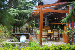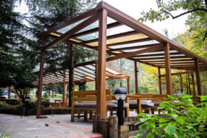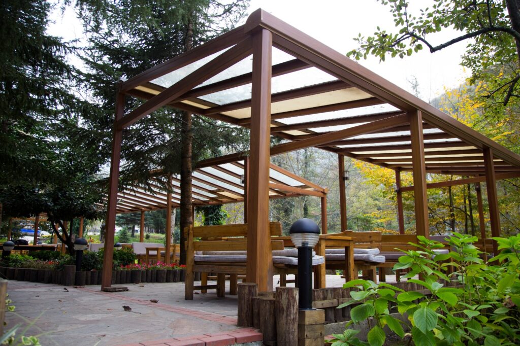 - Acoperiș: lamele fixe din aluminiu, asigurând o protecție eficientă împotriva ploii și a radiațiilor UV.